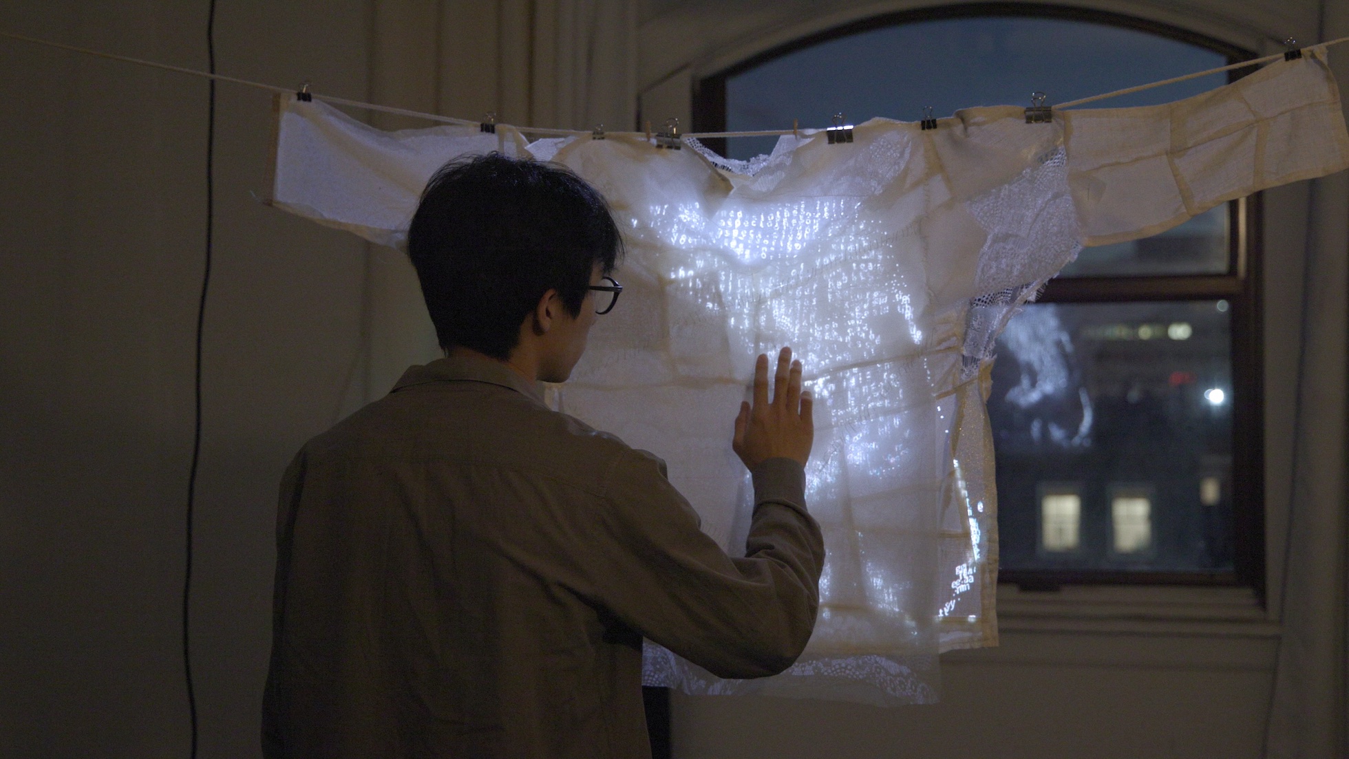 Textiles woven or stitched with conductive materials become smart objects that pass electronic signals while retaining their softness, elasticity, and other tactile qualities as fabrics. By intentionally channeling old fabrics from second-hand sources into resilient, soft, and tactile interfaces utilizing modern electronic technology, forgotten emotions and values are vividly relayed. Discarded garments originating from varying locales become symbols narrating stories tangled in space and time. In Cloth on Cloth(es), a piece of digital cloth augmenting layers of mended linen fabrics renders a harmonious superposition of past, present, and future, questioning the dichotomy of “high” and “low” technology, as well as values ingratiating the ‘newest-is-best’ that prevail in today’s society. This project presents the interplay of a piece of poem and a piece of fabric, the juxtaposition of medium and the duality of narratives. A digital, dynamic, fabric-like poem is untouchable, and yet the tactile of the stitched linen triggers the movements of the visual poem, envisioning an experimental way to experience old clothes, and imagining alternative narratives of sustainable materials.