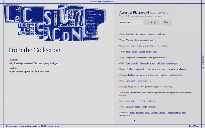 Above is a prompt I wrote for the large language model GPT 3.5 Turbo which currently powers chatGPT. In response to my prompt, the model creates acrostics but in sentences. Thousands of word-sentence pairs compose this project, Lecsicon: Linguists Enthusiastically Catalog Symbols, Interpreting Carefully Occurred Nuances.
