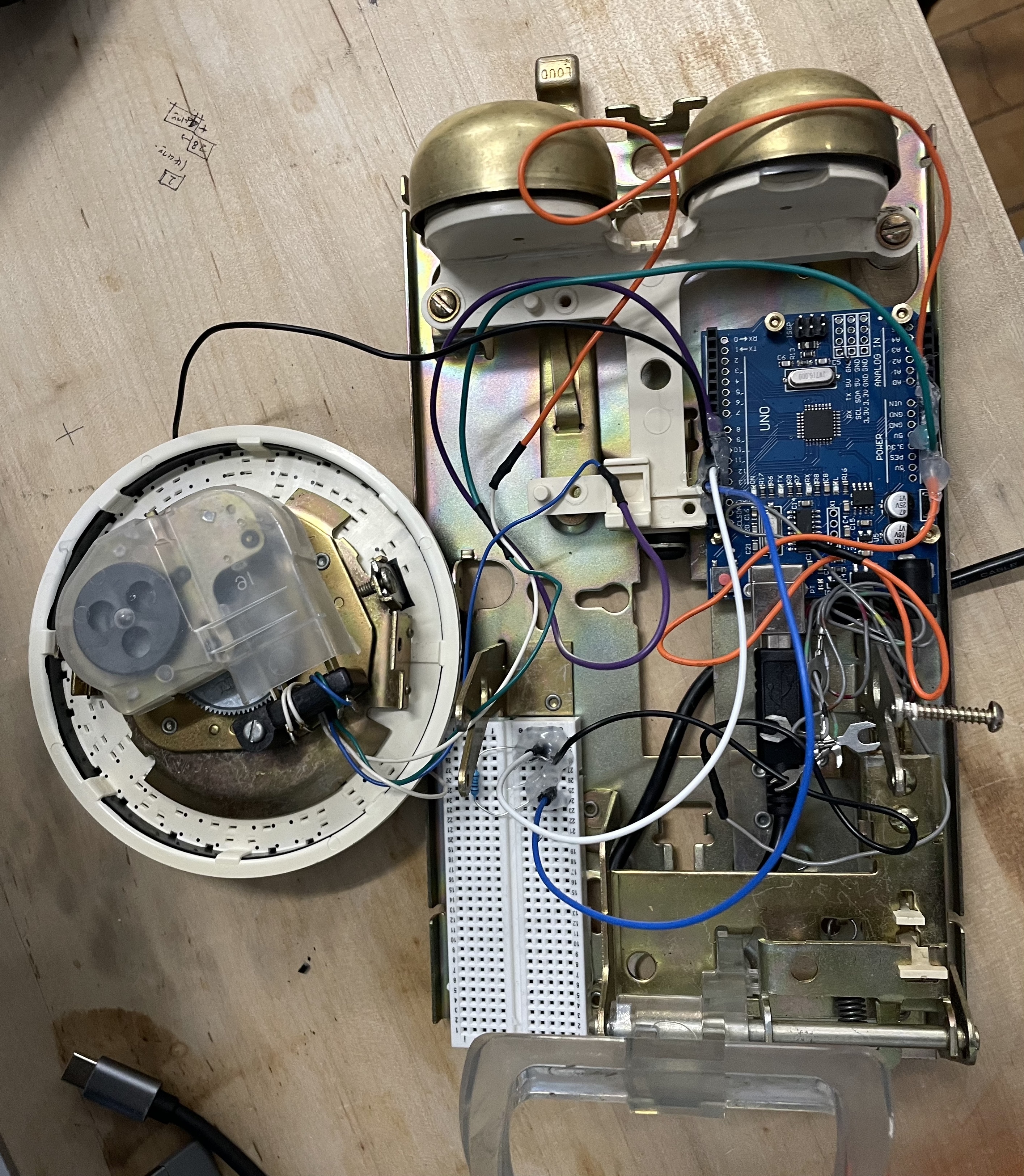 Internal structure of a rotary dial telephone with a custom-programmed arduino board