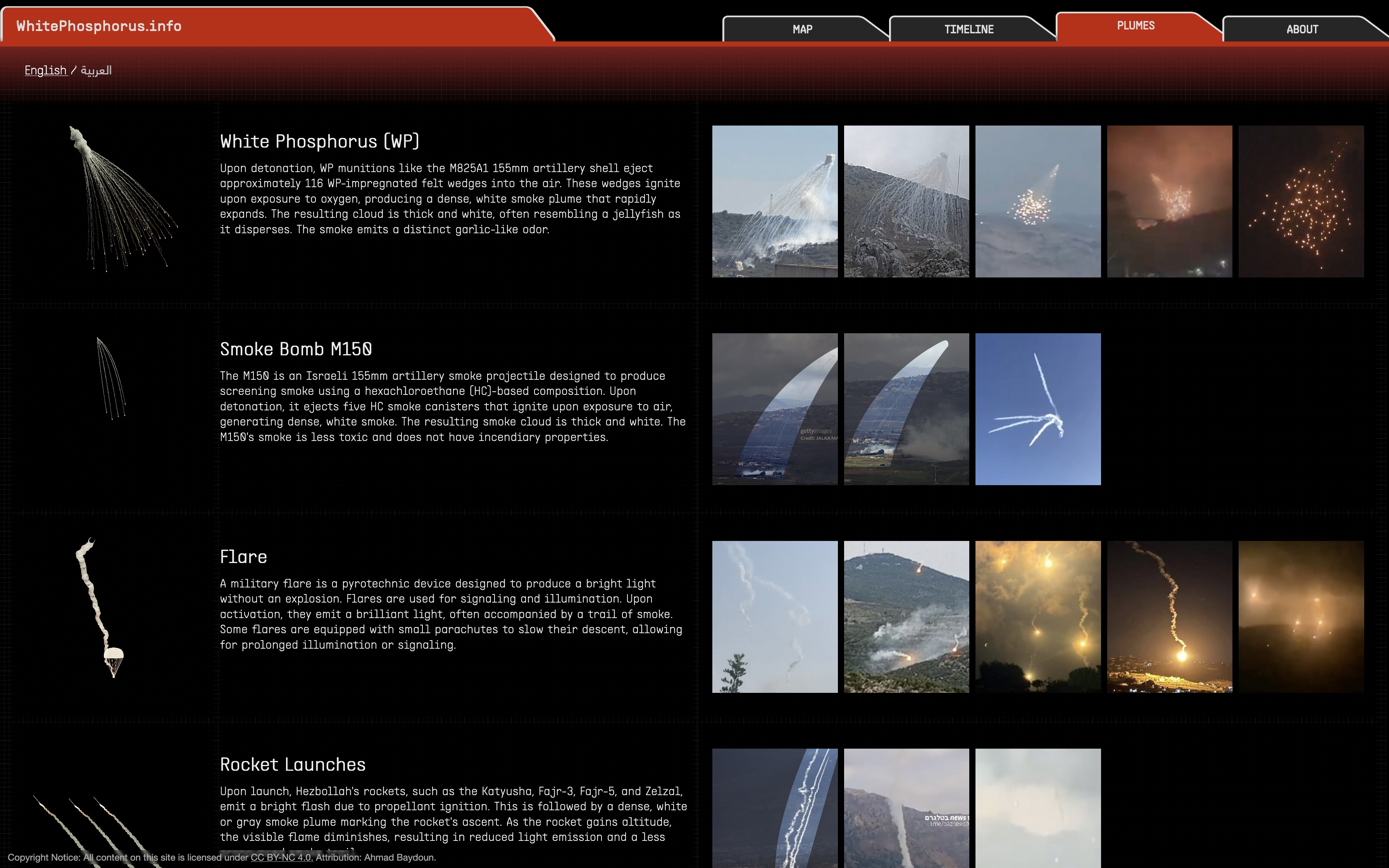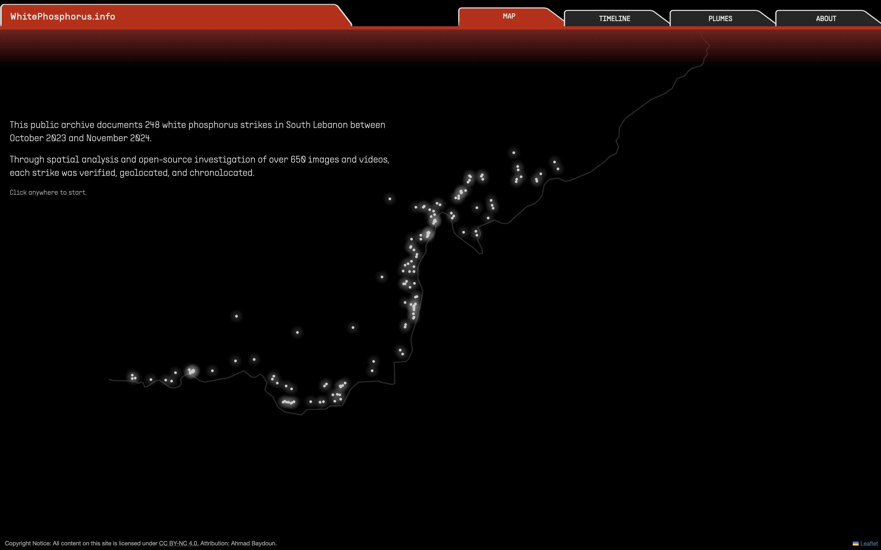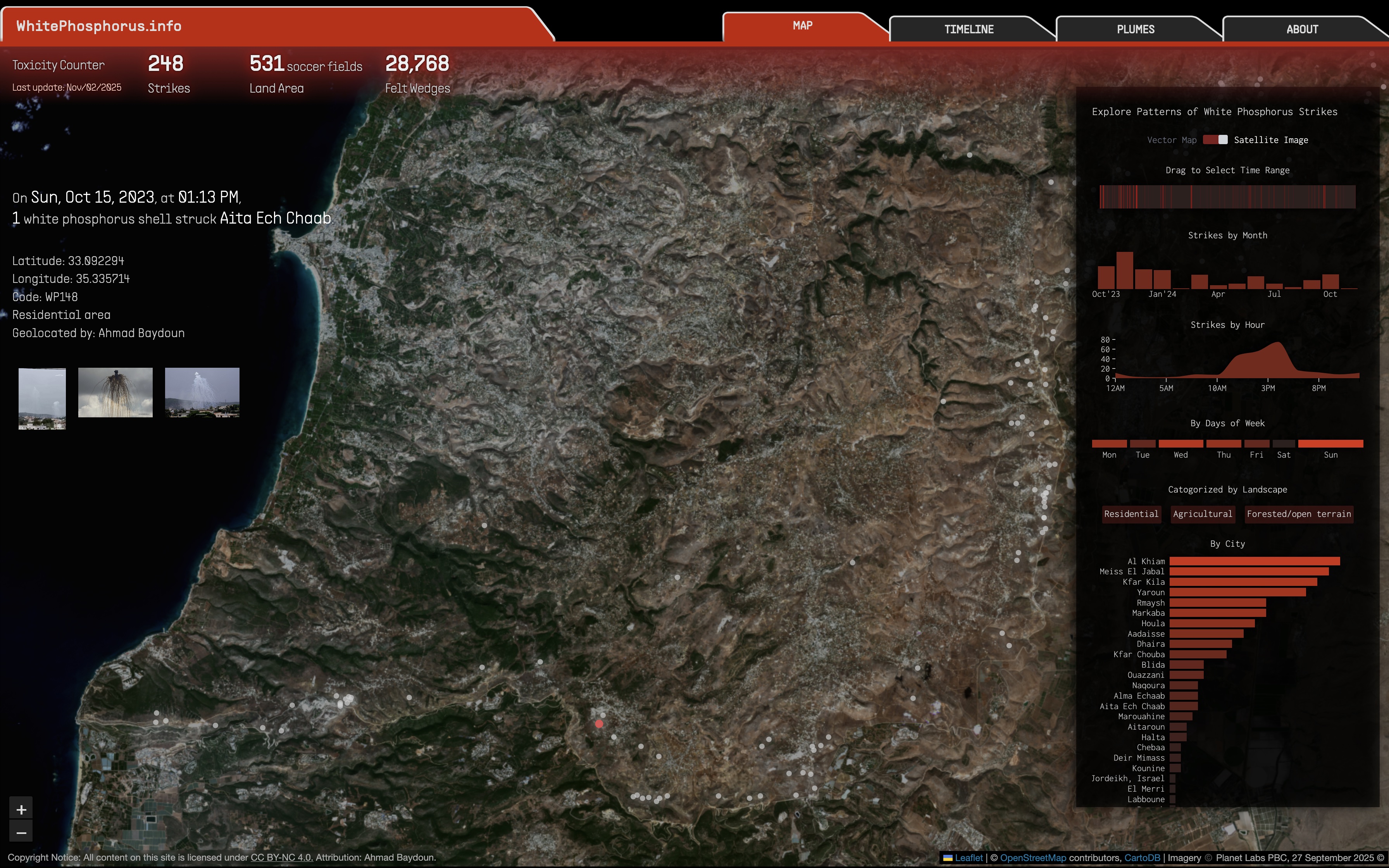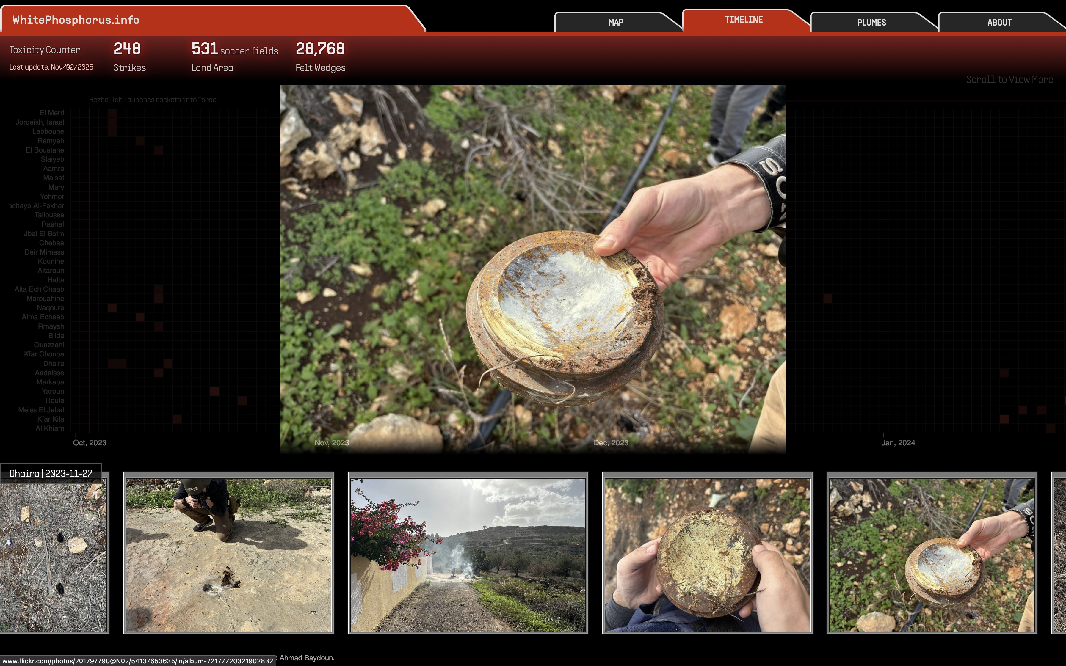 WhitePhosphorus.info is a website dedicated to documenting, visualizing, and analyzing white phosphorus attacks in South Lebanon. It features an interactive cartographic display that organizes incident data both chronologically and spatially, providing detailed insights into deployment patterns. The site serves as a continuously updated database for tracking the use of white phosphorus munitions in the region.
